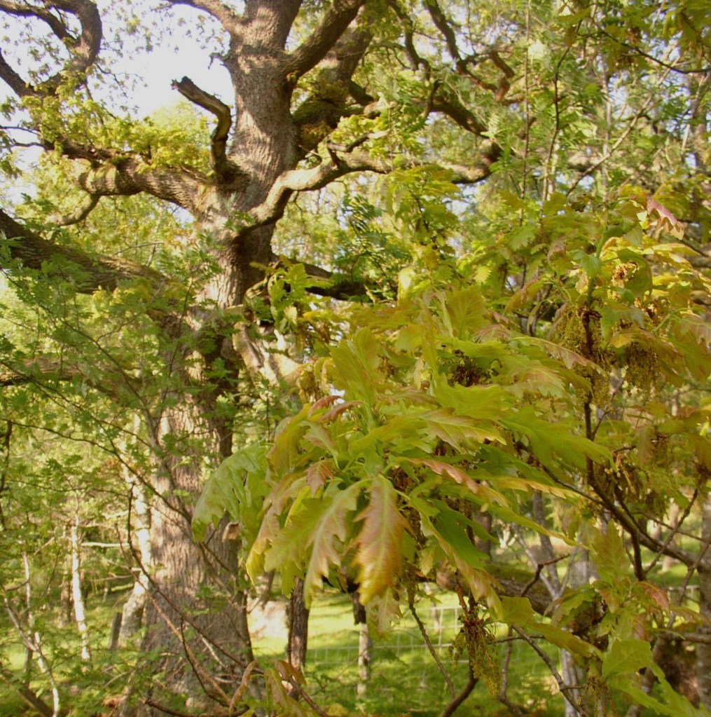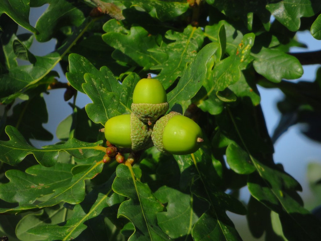 How d’you spot the difference? The English oak has bunches of leaves with no stalks with its acorns on stalks, the sessile is the opposite.