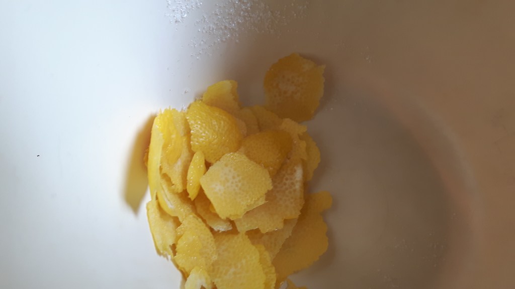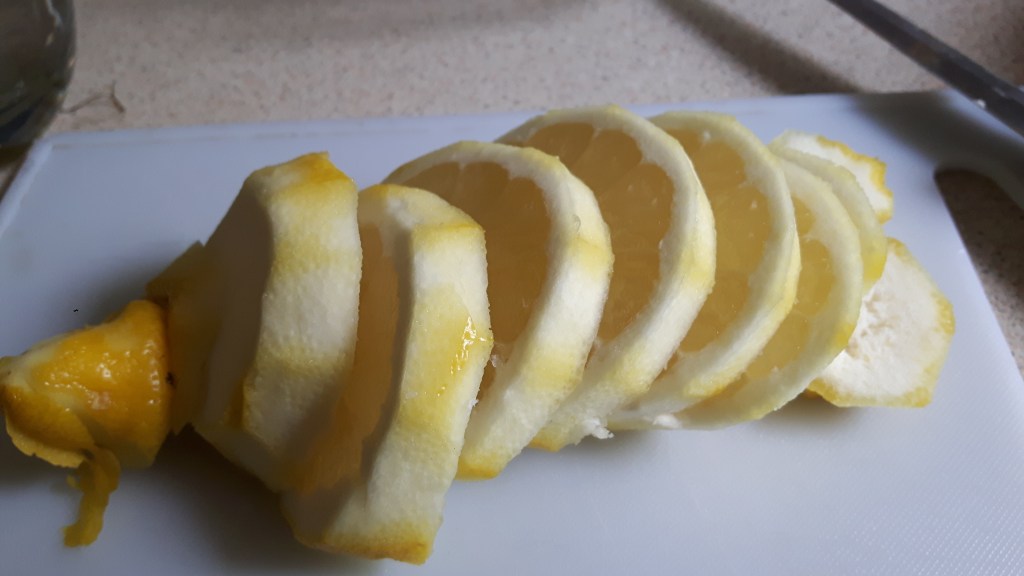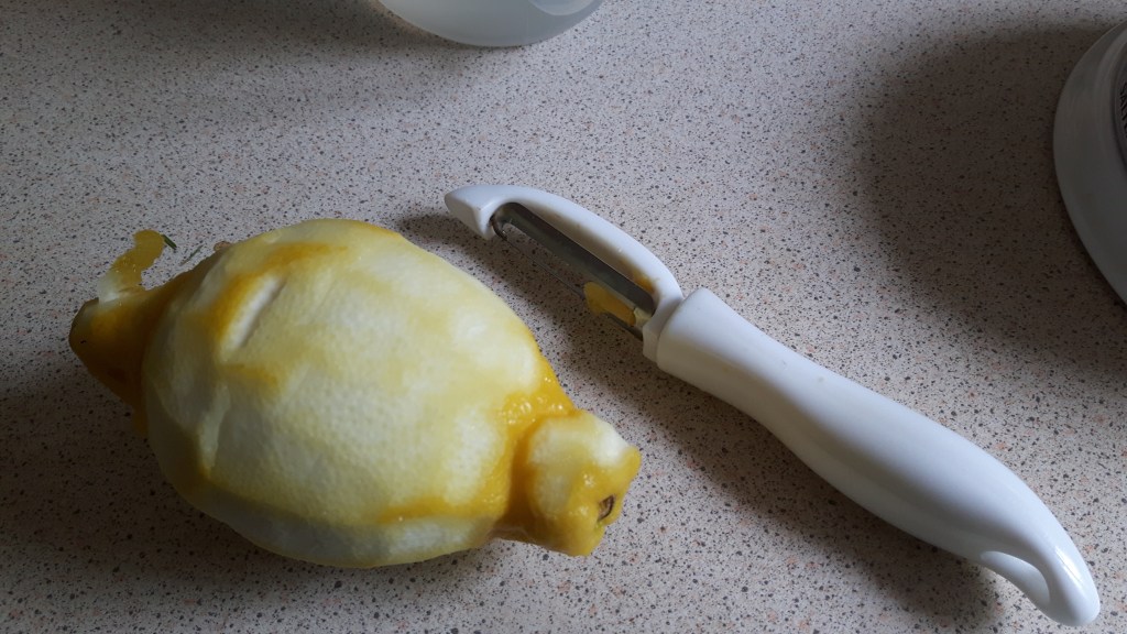 3. Take your lemon and shave the zest with a potato peeler. Now slice the fruit: