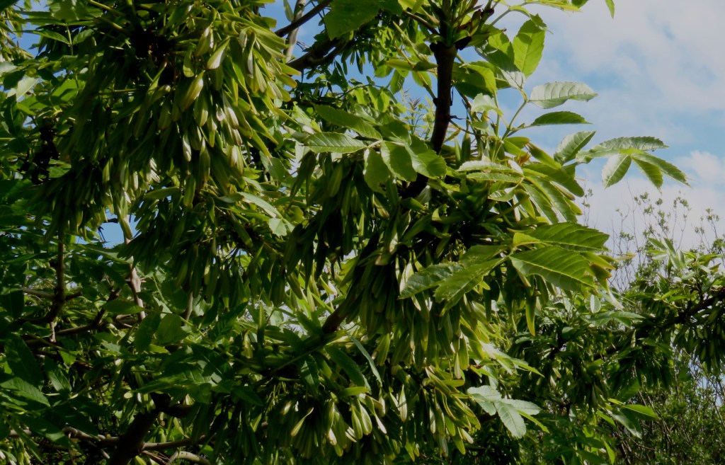 The ash tree usually has 13-15 leaflets, which are slim and long. In June the fruit are developing into long keys: