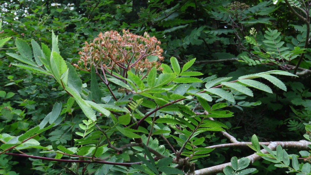 The rowan tree leaf has serrated leaflets on a red stem. The flowers form a white upright floret. They fade mid June to develop into bright red berries: